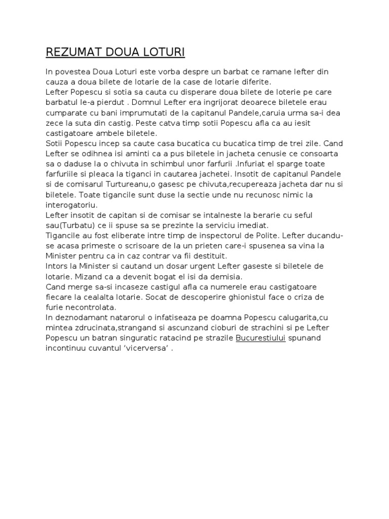 Rezumat doua loturi scurt. Frate am citit si alt undeva acest rezumat dar uitati aici. Ei s au dus la berărie. Doua loturi ion luca caragiale rezumat 1002741 domnul lefter si a cumparat 2 bilete de loterie cu banii imprumutati de la capitanul pandele apoi domnul lefter afost anuntat ca biletele sunt castigatoare fericit domnul lefter a inceput sa caute biletele dar nu le mai gaseste. Doua loturi de i l caragiale comentariu.