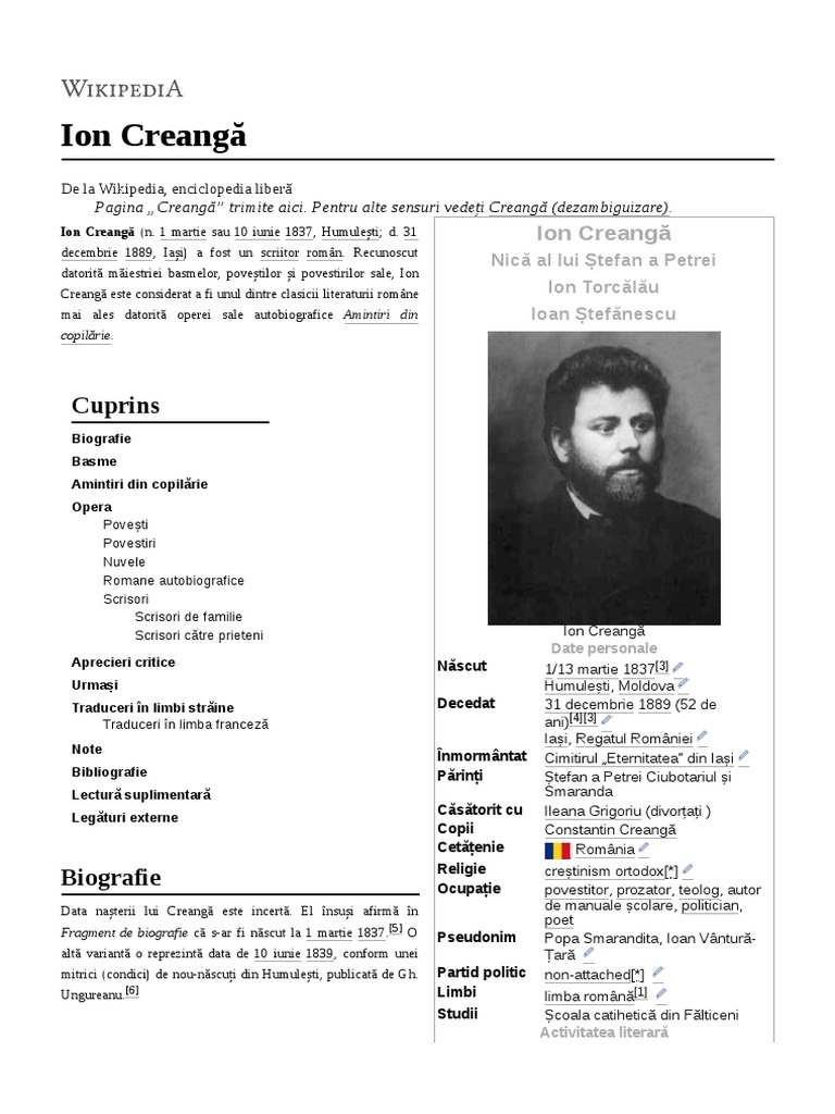 31 decembrie 1889 iași a fost un scriitor român recunoscut datorită măiestriei basmelor poveștilor și povestirilor sale ion creangă este considerat a fi unul dintre clasicii literaturii române mai ales datorită operei sale autobiografice amintiri din copilărie. Find indepartat din cler atat pentru ca s a despartit de sotia sa ileana si unui diacon nu ii era permis sa divorteze cat si pentru ca nu si a pastrat parul lung caracteristica. In 1867 ion creanga concepe si publica prima din sirul de carti ce vor urma respectiv primul sau abecedar. Ion creangă unul dintre clasicii literaturii române a murit la 31 decembrie 1889 la vârsta de 52 de ani.