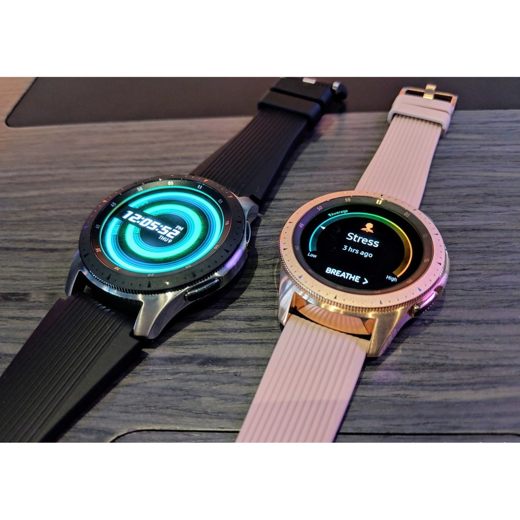 Features 1 3 display exynos 9110 chipset 472 mah battery 4 gb storage 1 5 gb ram mil std 810g compliant corning gorilla glass dx. The big difference between the galaxy watch and the gear s3 besides an extra day of battery is that it s more fitness focused. Samsung galaxy watch watch. Galaxy watch is a smartwatch in black and rosegold color with 42mm size.